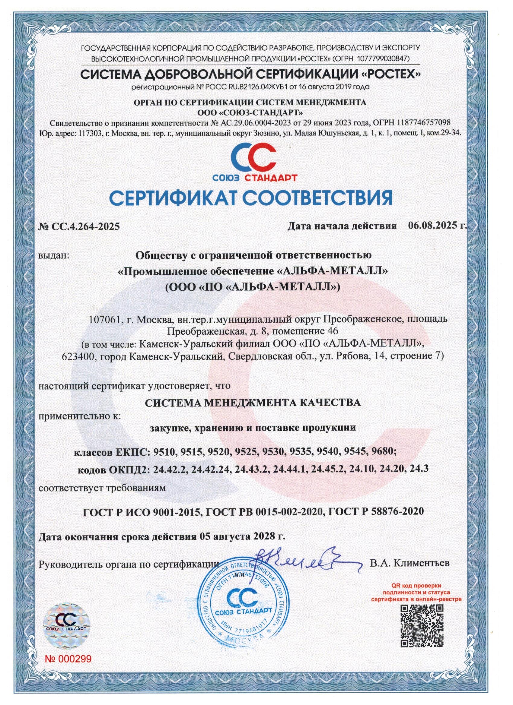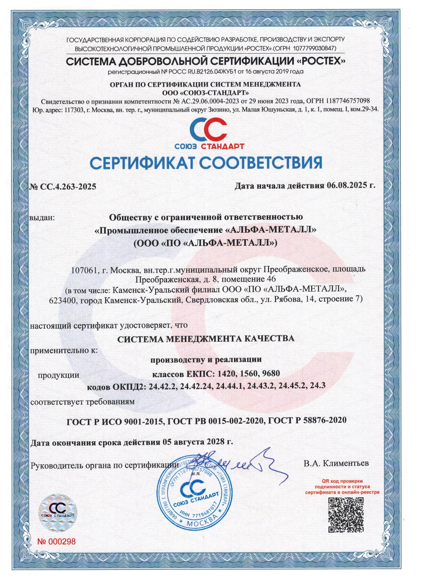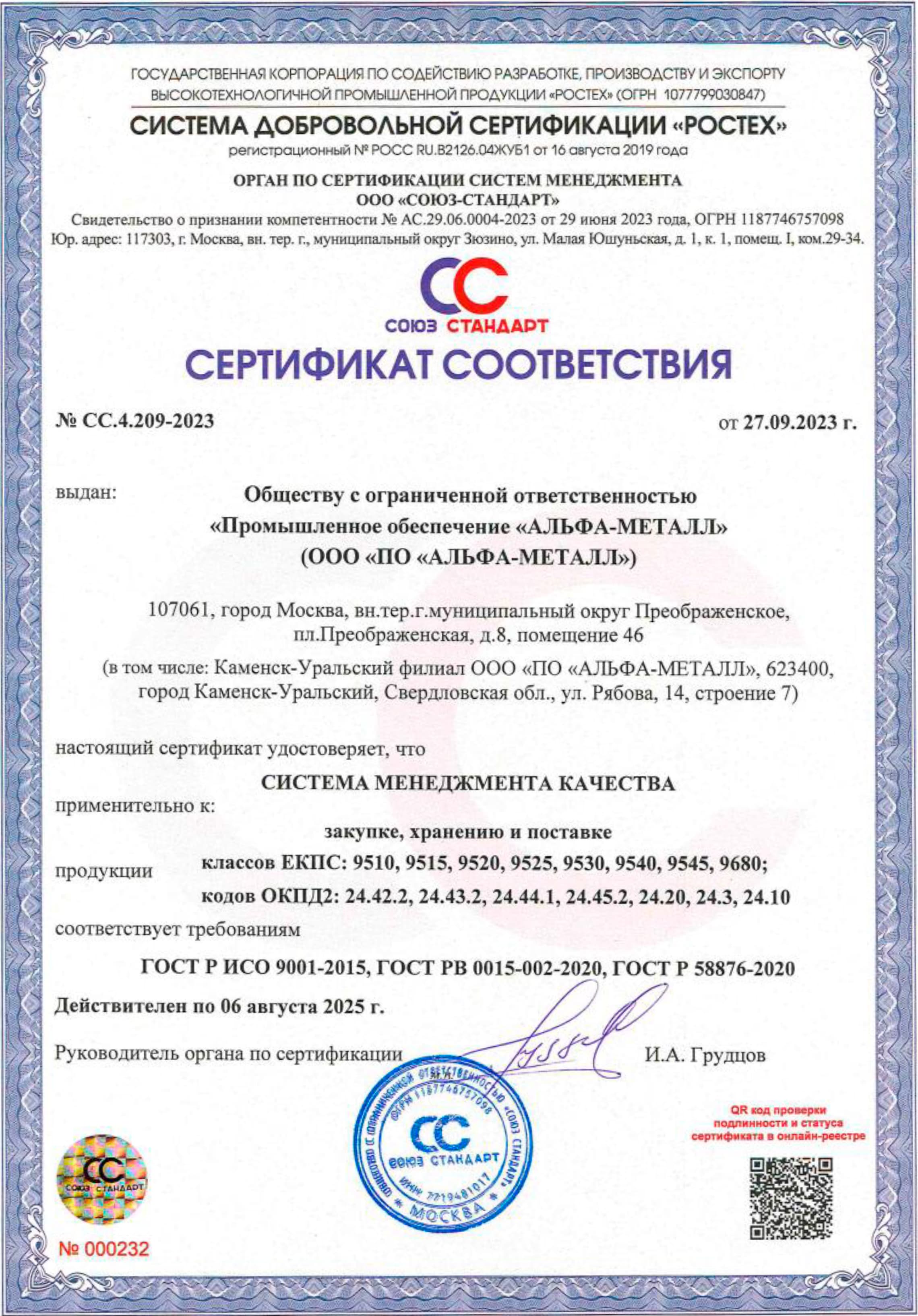 ООО «ПО «АЛЬФА-МЕТАЛЛ» получены сертификаты соответствия, подтверждающие, что система менеджмента качества на предприятии, применительно к закупке, хранению, поставке, производству и реализации продукции, соответствует требованиям ГОСТ Р ИСО 9001-2015, ГОСТ РВ 0015-002-2020, ГОСТ Р 58876-2020.